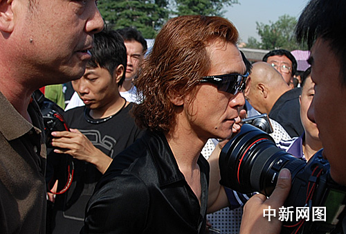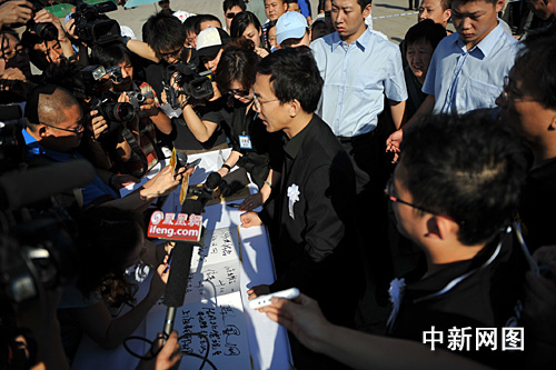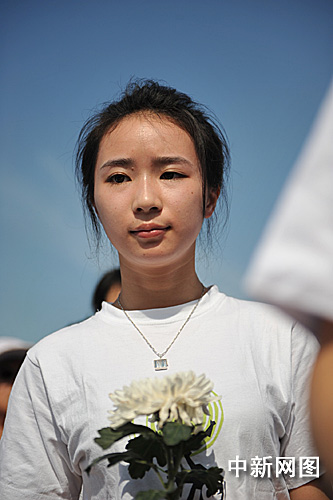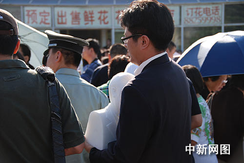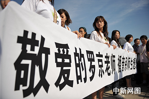 图:中国传媒大学学生手捧白花送别师兄罗京