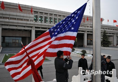 北京首都机场升起美国国旗迎接美国总统奥巴马