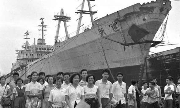 1958年11月27日,中国第一艘万吨远洋货轮“跃进号”下水。这艘远洋货轮由大连造船厂建造,使用当时最新的技术装备。它全长169.9米,载货量1.34万吨,排水量为2.21万吨,能在封冻的区域破冰航行。
