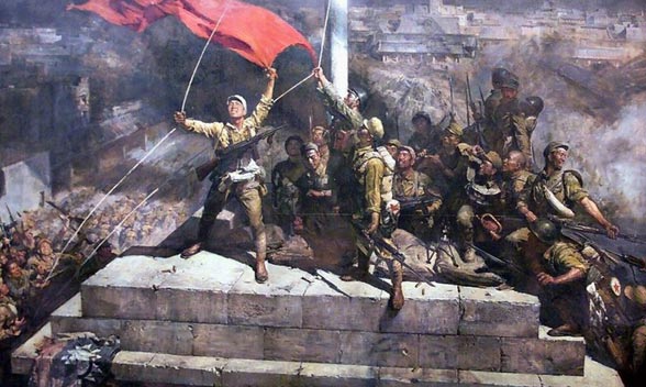 《占领总统府》表现的是中国人民解放军占领南京总统府,升上红旗的场面,标志着蒋家王朝的灭亡,新中国的开始。作品场面壮观,气势恢弘。画家用现实主义的创作方法使这一历史题材的创作具有纪念碑的意义。