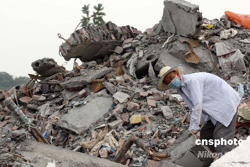图:幸存者在向娥中学废墟中寻找遗物