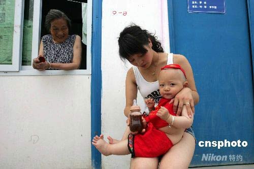 都江堰灾民安置点简易房前的祖孙三代