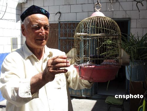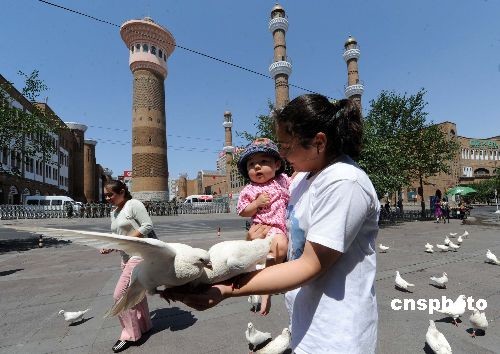 图:乌鲁木齐市民在大巴扎喂食广场鸽