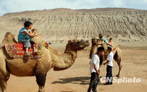 图:小游客骑骆驼游览新疆吐鲁番火焰山