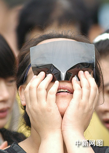 中国各地群众观看日食奇观:重庆市民用电焊面具看日食