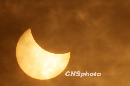中国各地观测日食奇观:江苏赣榆透过薄云看日食