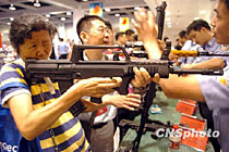 图:杭州市民展会上体验警用枪支