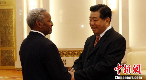 七月一日,全国政协主席贾庆林在北京人民大会堂会见以总书记、国民议会议长伊德里斯为团长的吉布提争取人民联盟代表团一行。中新社发 任海霞 摄