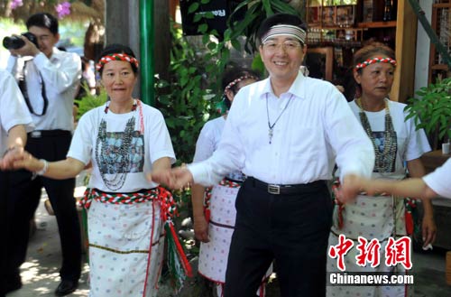 7月3日,中共广西壮族自治区委员会书记郭声琨(前右一)率团深入台湾花莲县乡村访问,与少数民族民众共舞。 中新社发 蒋雪林 摄