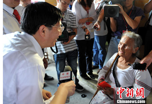 7月3日,中共广西壮族自治区委员会书记郭声琨深入台湾花莲县秀林乡农户访问,了解当地居民的生活。在访问中,郭声琨按照中华民族的风俗习惯,向长寿老人派发利是,祝福老人健康长寿。中新社发 蒋雪林 摄