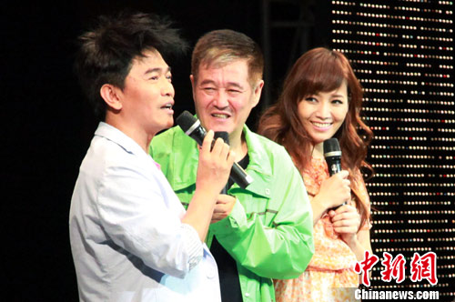 3日晚,来自辽宁的大陆著名艺术家赵本山携弟子小沈阳、毛毛等在台北奉献了一场精彩的二人转演出,全场笑声不断,绝无冷场。演出所得悉数捐予台湾两家慈善机构。此次是赵本山首次来台演出,以其创立的刘老根大舞台为班底。图为赵本山与台湾知名演员吴忠宪、侯佩岑合作演出。