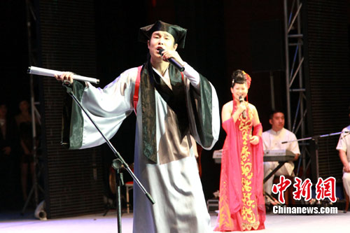 7月3日晚,大陆著名艺术家赵本山携弟子小沈阳、毛毛等在台北奉献了一场精彩的二人转演出,全场笑声不断。图为赵本山得意弟子小沈阳夫妇在演出小品《倩女幽魂》。中新社发 黄少华 摄