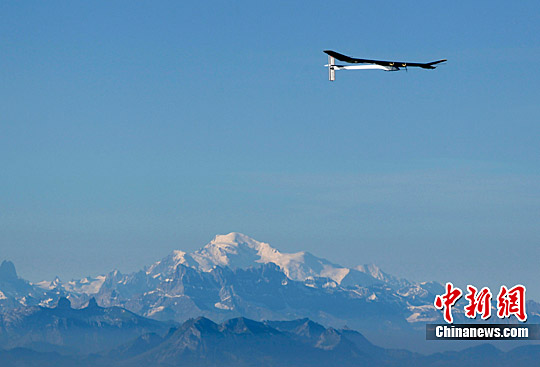 7月7日,瑞士佩耶纳,阳光动力公司行政总裁和飞行员安德烈·勃希伯格驾驶的太阳能驱动飞机在勃朗峰上飞翔。这架世界最大太阳能飞机于当地时间7日6时51分从瑞士帕耶那机场起飞,开始昼夜试飞。这是世界上首次进行太阳能飞机的夜间试飞。