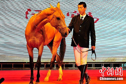 图为驯马师带领一匹汗血宝马亮相。中新社发 李克祥 摄