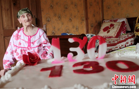 格鲁吉亚萨奇诺村,在这位长寿老人的130岁生日派对期间,安蒂莎·赫韦莎娃躺在床上。