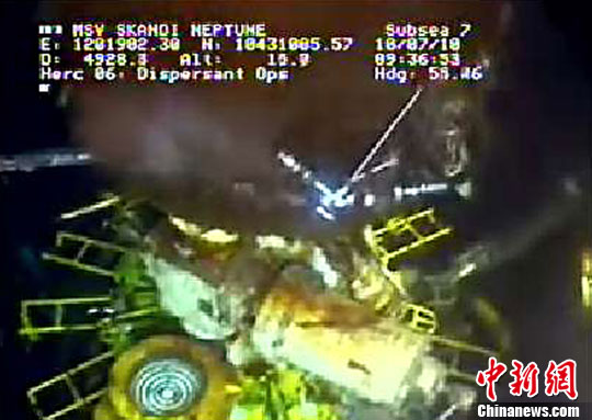 7月10日,英国石油公司卸下墨西哥湾漏油点上方的控油罩,为安装新控油罩做准备。