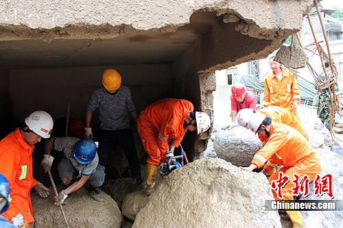 图为昭通市矿山救护队队员正在开展营救,清理山洪中滚落的巨石。中新社发 汪波 摄