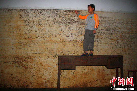 7月13日凌晨至下午17时,安徽池州贵池区普降大到暴雨,突发山洪,全区受灾人口35万,农作物受灾面积39366公顷,直接经济损失19870万元。图为贵池区潘桥居委会红星居民组村民王秀芳的儿子对记者说当时的洪水已经淹到了二楼楼顶。中新社发 张娅子 摄