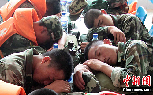 图为安徽池州武警支队官兵在抗洪救援24小时后稍事休息随时待命。中新社发 张娅子 摄