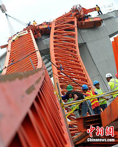 7月14日,在菲律宾大马尼拉地区的帕拉尼亚克市,工人在维修被台风“康森”吹倒的塔吊。菲律宾国家救灾协调委员会当天通报,台风“康森”在菲律宾已造成8人死亡、57人失踪。