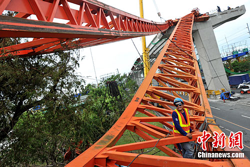 7月14日,在菲律宾大马尼拉地区的帕拉尼亚克市,工人在维修被台风“康森”吹倒的塔吊。