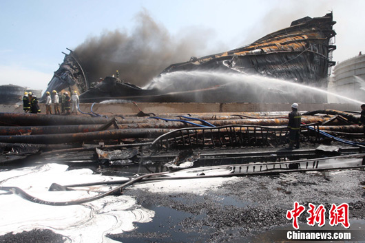 7月18日下午,大连新港爆炸事故现场的浓烟开始变淡。大连市公安局副局长宁民表示,经专家评估现场已基本安全。大连新港输油管道7月16日晚发生爆炸事故,大火燃烧15小时才基本被扑灭。图为该次事故大火已将爆炸点附近一个储油罐完全烧毁。