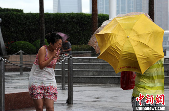 7月21日,热带气旋“灿都”正步步紧逼香港,为其打头阵的大风阵雨袭击着正在金紫荆广场上的游客。据天文台预报“灿都”目前集结于香港西南偏南约400公里,以时速10公里左右向西北方向移动。香港挂出1号戒备风球,防患于未然。中新社发 郑祚声 摄