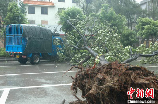 在南海两次“实施”90度急转弯的今年第3号台风“灿都”,7月22日13时45分在粤西湛江吴川市吴阳镇沿海地区登陆,中心最大风速每秒35米,最大风力12级。台风带来的极强破坏力,吴川附近地区茂名市等亦受影响,当地曾一度停水停电。台风将市区路边的树木被连根拔掉。中新社发 梁盛 摄
