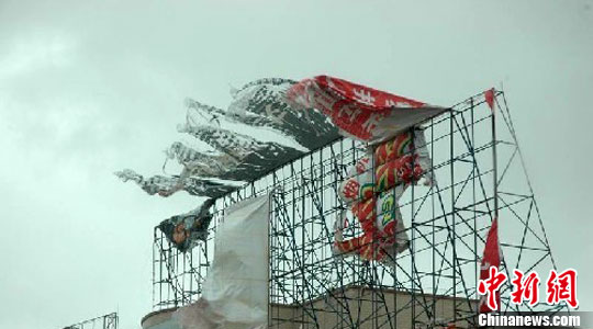 台风带来的极强破坏力,吴川附近地区茂名市亦受影响,当地曾一度停水停电,市区内的广告牌亦被吹到支离破碎。中新社发 梁盛 摄