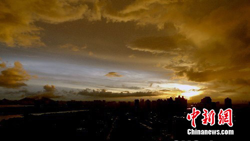 7月22日第3号台风“灿都”登陆广东湛江,19时许,深圳受强台风影响天空出现奇观,东面有大跨度彩虹,西面呈现落日晚霞,一会又阵雨不断。中新社发 陈文 摄