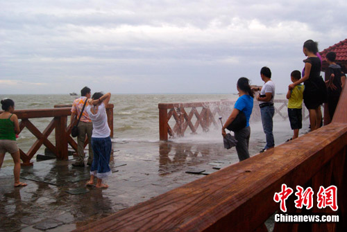 7月22日傍晚,一群游客在广西北海市外沙岛观景码头观看今年第3号台风“灿都”带来的大风巨浪。中新社发 翟李强 摄