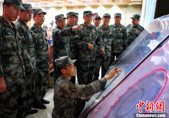 8月4日,济南战区“前卫--2010”防空部队单元合成演练最高指挥部在综合分析实时空中情况,指挥部队展开联合侦察预警行动。演练前三天的检验性阶段,实施紧急疏散、作战筹划、侦察预警、信息对抗、对空抗击、指挥所、阵地转移和研究、试验、论证陆军防空部队各类主战作战单元在复杂电磁环境下对空作战的对策。中新社发 宋吉河 摄