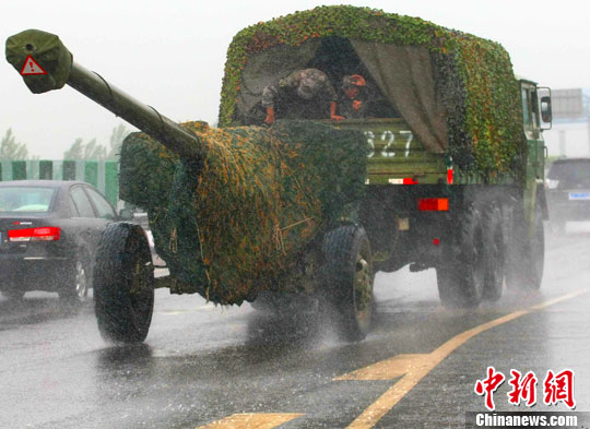 8月5日上午,济南战区“前卫--2010”防空部队单元合成演练正在进行中,一支防空高炮部队冒雨实施阵地转移。在演练前三天的检验性阶段,重点实施了紧急疏散、作战筹划、侦察预警、信息对抗、对空抗击、指挥所、阵地转移等作战演练。