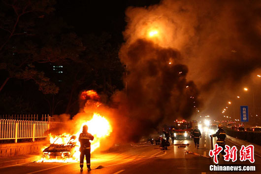 8月5日22时左右,在北京西二环白纸坊桥北侧,一辆小轿车发生自然,大火被随即赶来的消防队员扑灭,但车辆已面目全非。 中新社发 富田 摄