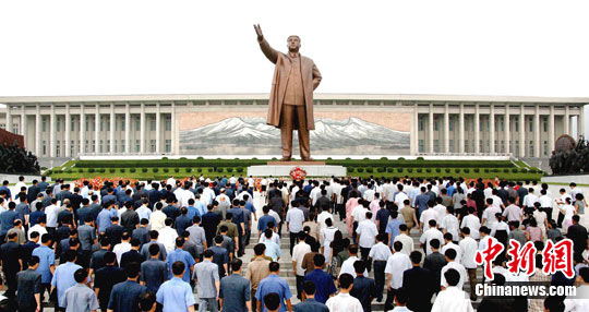 8月16日,朝鲜平壤,朝鲜民众在平壤金日成的雕塑前纪念解放日。今年8月15日是朝鲜半岛摆脱日本殖民统治获得解放65周年纪念日,朝鲜在这一天举行多种庆祝活动。