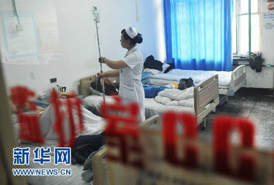 8月16日,医护人员在为爆炸中的受伤人员输液。王建威 摄