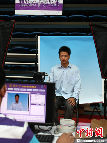 8月25日,新入学的本科生在清华大学综合体育馆拍摄证件照片。中新社发 苏丹 摄
