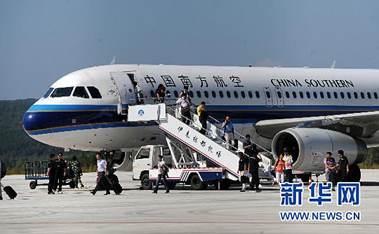 8月26日,乘飞机前往伊春的旅客走下飞机。当日,于8月25日暂停使用的黑龙江省伊春市林都机场恢复使用,开始正常航班起降。李勇 摄