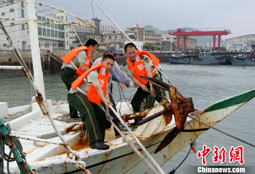 图为在福建东山港台轮专用码头,20多艘台轮前来避风,东山县边防大队城关边防工作站官兵正在协助台湾渔民加固绳缆。中新社发 谢汉杰 摄