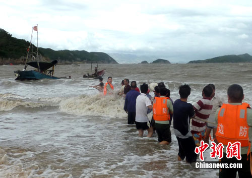 8月31日,在福建霞浦渔洋北兜澳口,边防民警同当地民众合力救助一艘遇险渔船。受“狮子山”、“南川”等热带风暴的影响,福建霞浦北兜澳口海面风高浪急,一艘停泊在北兜澳口的渔船被海浪打破船舱,发生漏水事故。 台风“圆规”、“狮子山”、“南川”相伴凶猛袭来,并将给中国东南沿海带来今年以来范围最大台风雨,几乎所有的海岸线都将或多或少受到三个台风的风雨影响。
