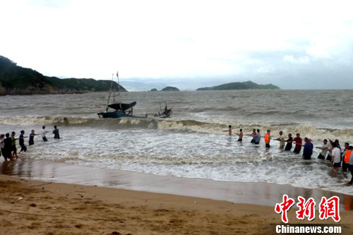 8月31日,在福建霞浦渔洋北兜澳口,边防民警同当地民众合力救助一艘遇险渔船。中新社发 王力鹏 摄