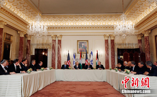 在美国国务卿希拉里的主持下,巴勒斯坦领导人阿巴斯和以色列总理内塔尼亚胡自2008年年底后第一次坐在同一张谈判桌前。