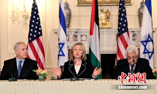 在美国国务卿希拉里的主持下,巴勒斯坦领导人阿巴斯和以色列总理内塔尼亚胡自2008年年底后第一次坐在同一张谈判桌前。