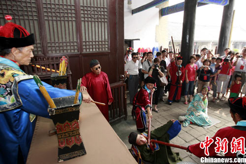 9月4日,河南南阳,内乡古县衙升堂审理一桩杀人凶案,使人们了解古代审案之法,令人叹为观止。内乡古县衙始建于元代,距今已有700多年的历史,占地27000平方米,房舍260余间,珍存文物近千件,是中国目前保存较完整的封建时代县级官署衙门,也是中国第一座衙门博物馆。