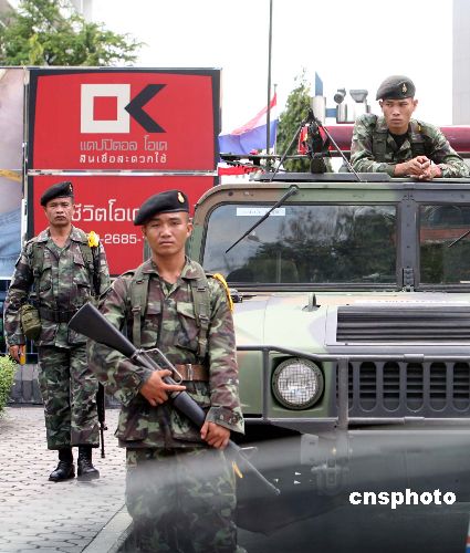 9月25日,泰国士兵在曼谷市区要道持枪警戒。泰国军政府将成立调查小组,调查前总理他信执政时期政府计划有否涉及贪渎。据调查小组发出的声明称,如果他信与其阁员滥用自身权力的罪证确凿,遭指控者的妻子、儿女之资产也将被没收。中新社发 洪少葵 摄