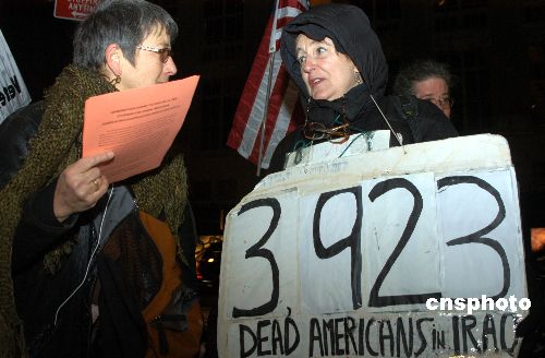 图为祖母反战团的创始人七十六岁的琼维莉(右)胸前挂着截至当日在伊战阵亡的美军士兵总人数的牌子。
