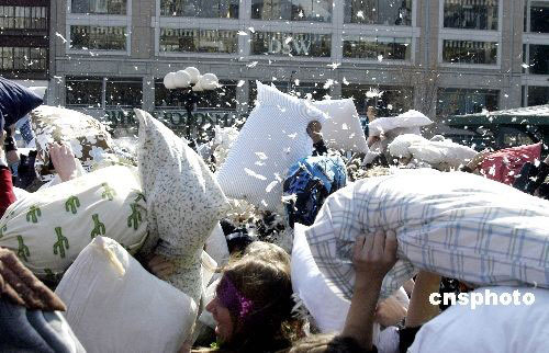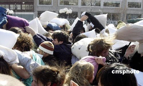 3月22日,纽约数百名青年聚居在曼哈顿联合广场展开一年一度的枕头大战。大家用睡了一个冬天的枕头将彼此“砸醒”,笑迎春天的到来。中新社发 邓悦 摄