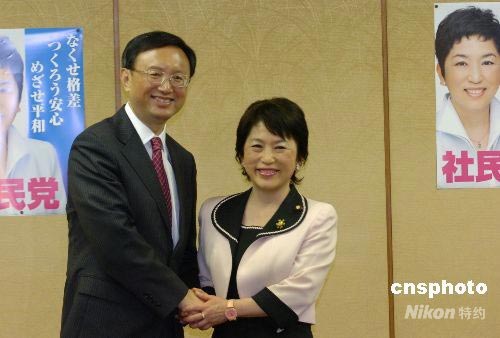 4月18日上午,外交部长杨洁篪在东京社民党总部会见了日本社民党党首福岛瑞穗女士。福岛瑞穗女士对杨洁篪部长的来访表示热烈欢迎,并祝愿继韩国汉城奥运会之后时隔20年再次在亚洲举办的北京奥运会取得圆满成功。中新社发 朱沿华 摄