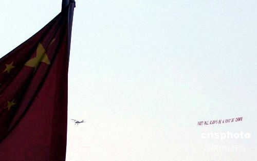 4月22日,纽约华人华侨租用一架小型飞机飞越曼哈顿,打出“西藏永远是中国的一部分”的横幅。中新社发 龚文谟 摄
