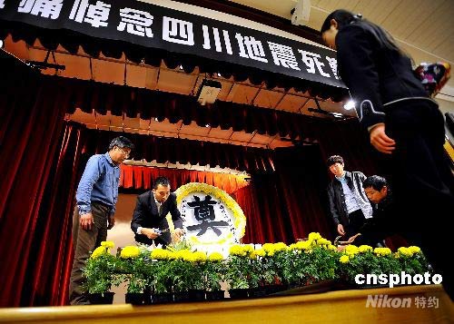 黄色和白色菊花制作的花圈,白色蜡烛围成的心型,中国驻旧金山总领馆工作人员于当地时间十八日夜间在领馆设立灵堂,哀悼四川汶川大地震的遇难同胞。从十九日起连续三天,领馆大厅将对公众开放,悼念遇难者。中新社发 陈钢 摄